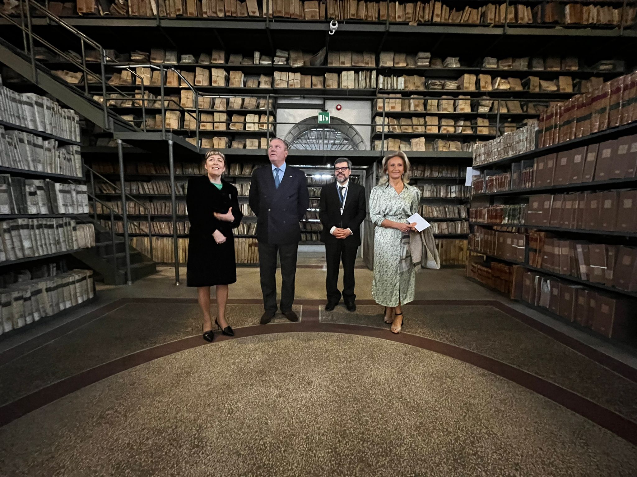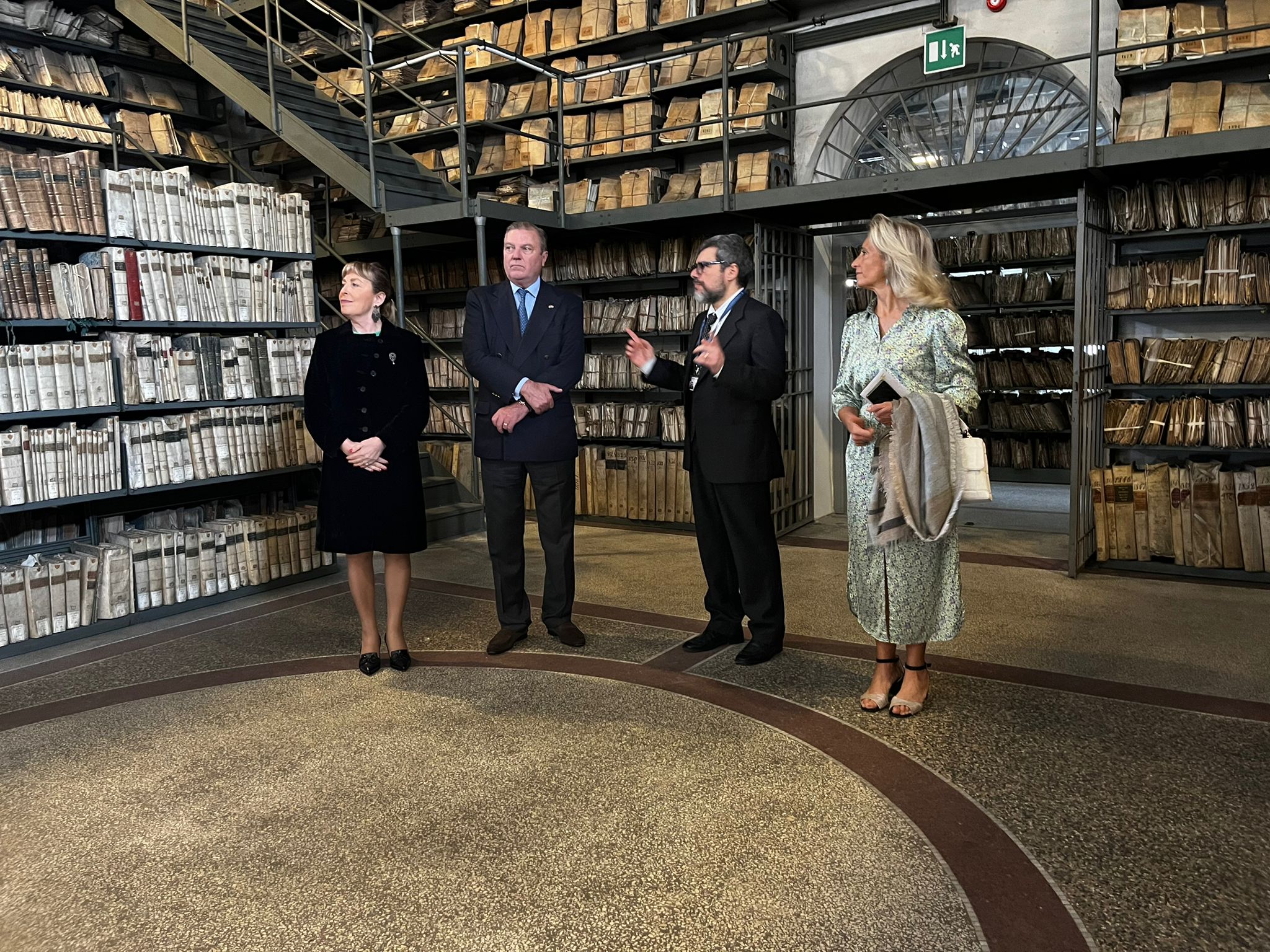 S.A.R. è stato ricevuto dalla Prof.ssa Candida Carrino, Direttrice dell’Archivio di Stato di Napoli, che lo ha guidato in un percorso di visita attraverso gli ambienti monumentali dell’edificio dei SS. Severino e Sossio: la Sala Filangieri, la Sala Catasti, il Chiostro del Platano, l’antisala della Direzione con la Carta lapidaria, il documento più antico custodito dall’Archivio, il Salone della Regia Camera della Sommaria, il Salone di Casa Reale e la Sala degli archivi gentilizi.