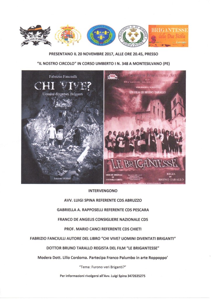 La conferenza ha visto la partecipazione dell’ Avv. Luigi Spina, referente regionale CDS,che ha introdotto la serata, l’intervento in apertura, del dottor Bruno Tarallo, regista del film Le Brigantesse, dello scrittore Fabrizio Fanciulli, autore del libro “Chi vive? Uomini diventati Briganti”, del professor Mario Canci sul tema il brigantaggio abruzzese in rime e musica, referente dei Comitati Due Sicilie per la provincia di Chieti, con il supporto dell’insostituibile Gabriella Anna Rapposelli, attrice e referente per la provincia di Pescara dei CDS che ha trattato il delicato tema sulla trattativa stato italiano mafia e camorra.