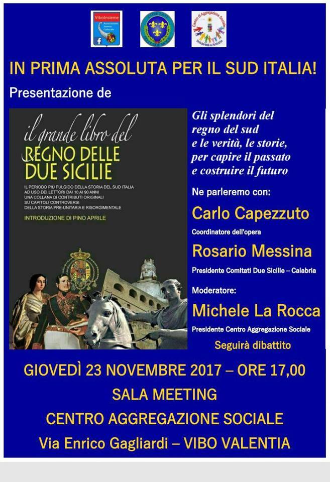 Dopo Udine e Milano, lai??i??opera, edita ad inizio novembre, sarAi?? presentata in anteprima assoluta per il Sud Italia a Vibo Valentia, da dove inizia il tour che toccherAi?? tutte le regioni meridionali. A spiegare perchA? A? nato ai???Il Grande Libro del Regno delle Due Sicilieai???, chi lai??i??ha scritto e ad esporne i contenuti, sarAi?? Carlo Capezzuto, uno degli autori e coordinatore dellai??i??opera, nellai??i??incontro in programma giovedAi?? 23 novembre 2017 alle ore 17,00 al Centro di Aggregazione Sociale ai???SolidarietAi?? ed Amiciziaai??? di Vibo Valentia.