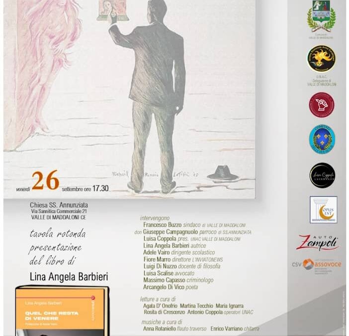 Venerdì 26 settembre 2025, presso la Chiesa di SS Annunziata, via Sannitica Commerciale 21, Valle di Maddaloni (CE), sarà presentato il libro di Lina Angela Barbieri, “Quel che resta di Venere”.